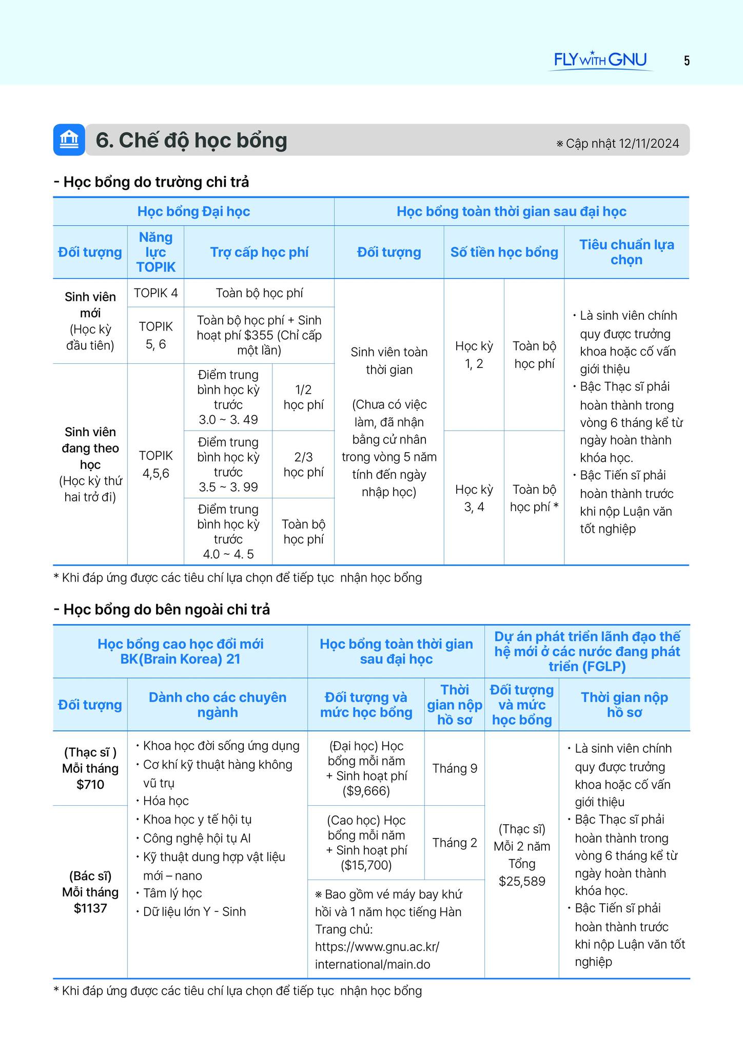 🔹 Học bổng ngoài trường (Brain Korea 21, FGLP, v.v.):