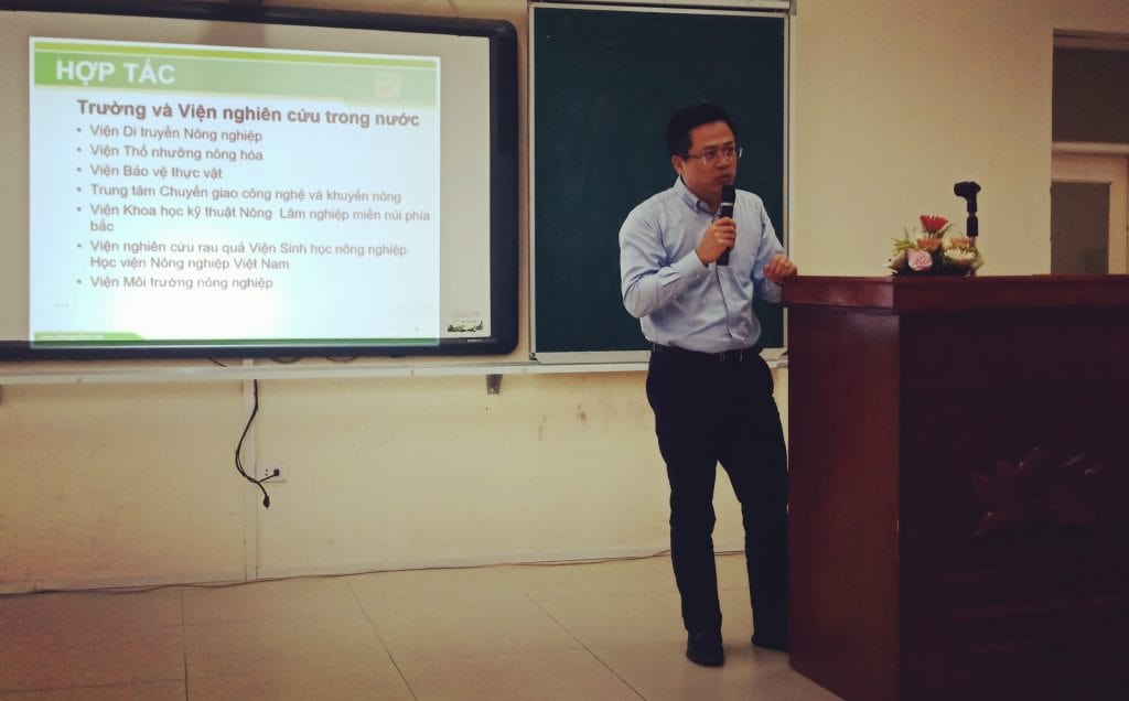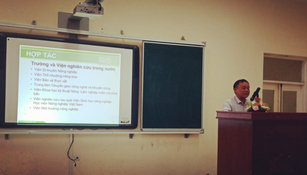 Các lãnh đạo đến từ các đơn vị thuộc Bộ Nông nghiệp và phát triển nông thôn TS. Lê Quốc Thanh – Giám đốc Trung tâm chuyển giao khuyến nông, TS. Nguyễn Văn Liêm – Viện trưởng Viện Bảo vệ thực vật, TS. Trần Minh Tiến – Phó viện trưởng viện Thổ Nhưỡng Nông hóa, TS. Đặng Trọng Lương – Phó viện trưởng viện Di truyền Nông nghiệp – có đôi lời giới thiệu về đơn vị và chia sẻ với sinh viên. Các đơn vị đều sẵn sàng hợp tác về đào tạo và nghiên cứu trong lĩnh vực công nghệ nông nghiệp và chào đón các bạn sinh viên đến để thực tập và tham gia các dự án nghiên cứu.