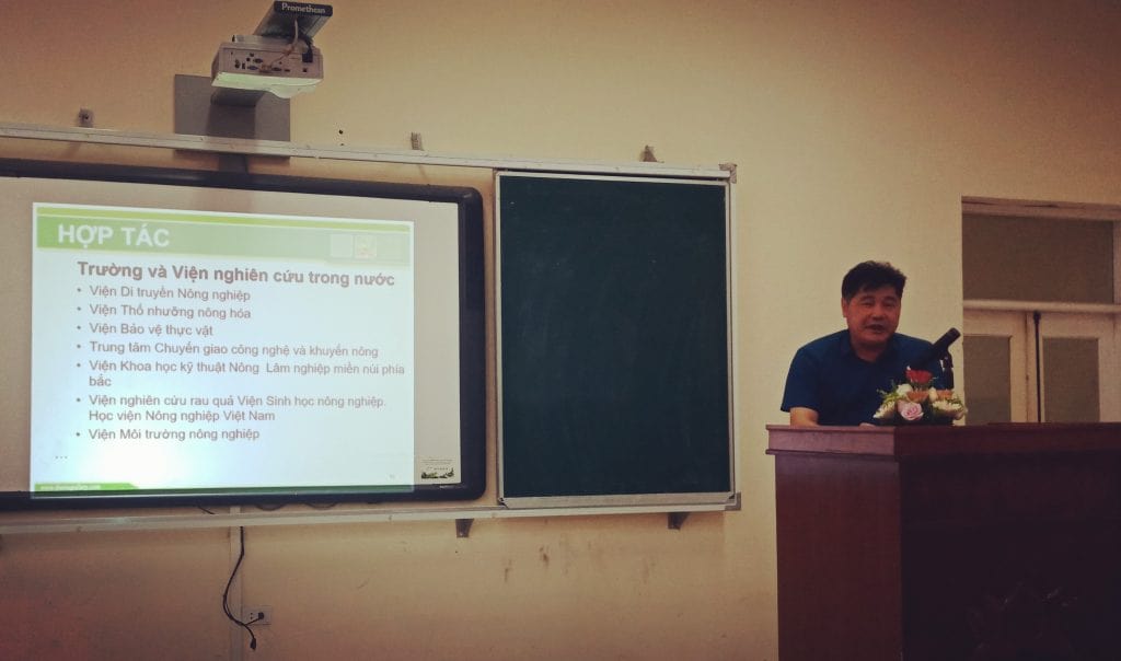 Với tư cách đại diện cho Doanh nghiệp Công nghệ nông nghiệp – Công ty CP Giải pháp Thời tiết và Nông nghiệp AgriMedia và Viện Công nghệ Xanh GreenTech, trong áo đồng phục màu xanh của AgriMedia, PGS.TS. Mai Quang Vinh đã có bài chào mừng và giao lưu trao đổi cảm hứng với lớp trẻ đang bước vào con đường học vấn công nghệ tiên tiến trong nông nghiệp – Mô hình đào tạo một ngành nghề mới, đi thẳng vào nông nghiệp công nghệ cao, hy vọng sẽ đào tạo ra lớp thanh niên trí thức có trình độ Nghiên cứu và Thực hành Công nghệ Nông nghiệp 4.0 cho sản xuất và các doanh nghiệp. Hy vọng AgriMedia sẽ có hợp tác, đặt hàng nhân sự cho Khoa trong nhiều năm tới.