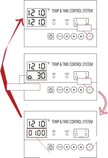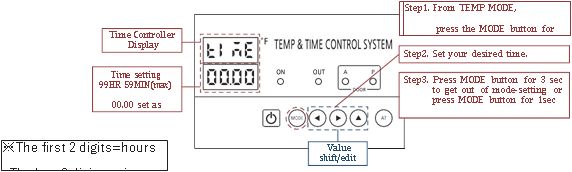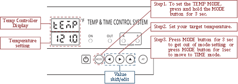 ![]() (7) Checking the remaining operation time and the output of heater ➡ You can check the output of heater by clicking "AT" button for 1 sec. ➡ You can check the remaining operating time by clicking "AT" button one more time. ➡ You can return to the original display by clicking "AT" button one more time. ![]() |