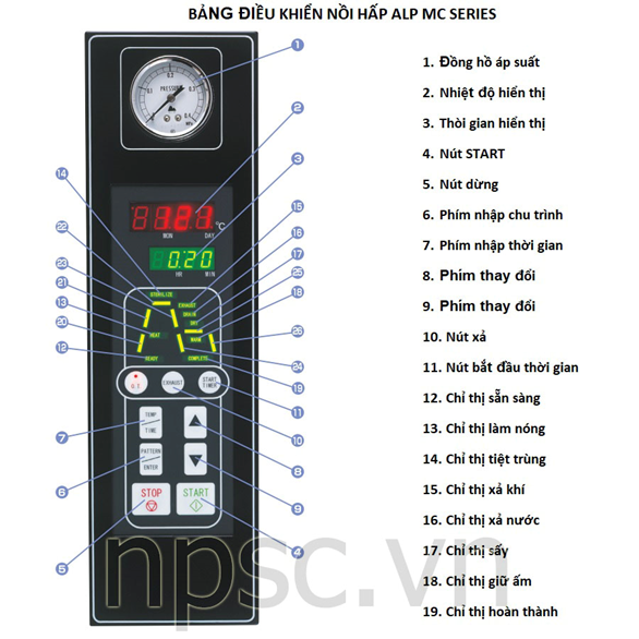 B9. Khi đồng hồ áp suất về 0. Nhiệt độ dưới 80 độ C, đèn Complete nháy sáng báo hiệu hoàn tất chu trình khử trùng. Lúc đó mới được mở nắp nồi.