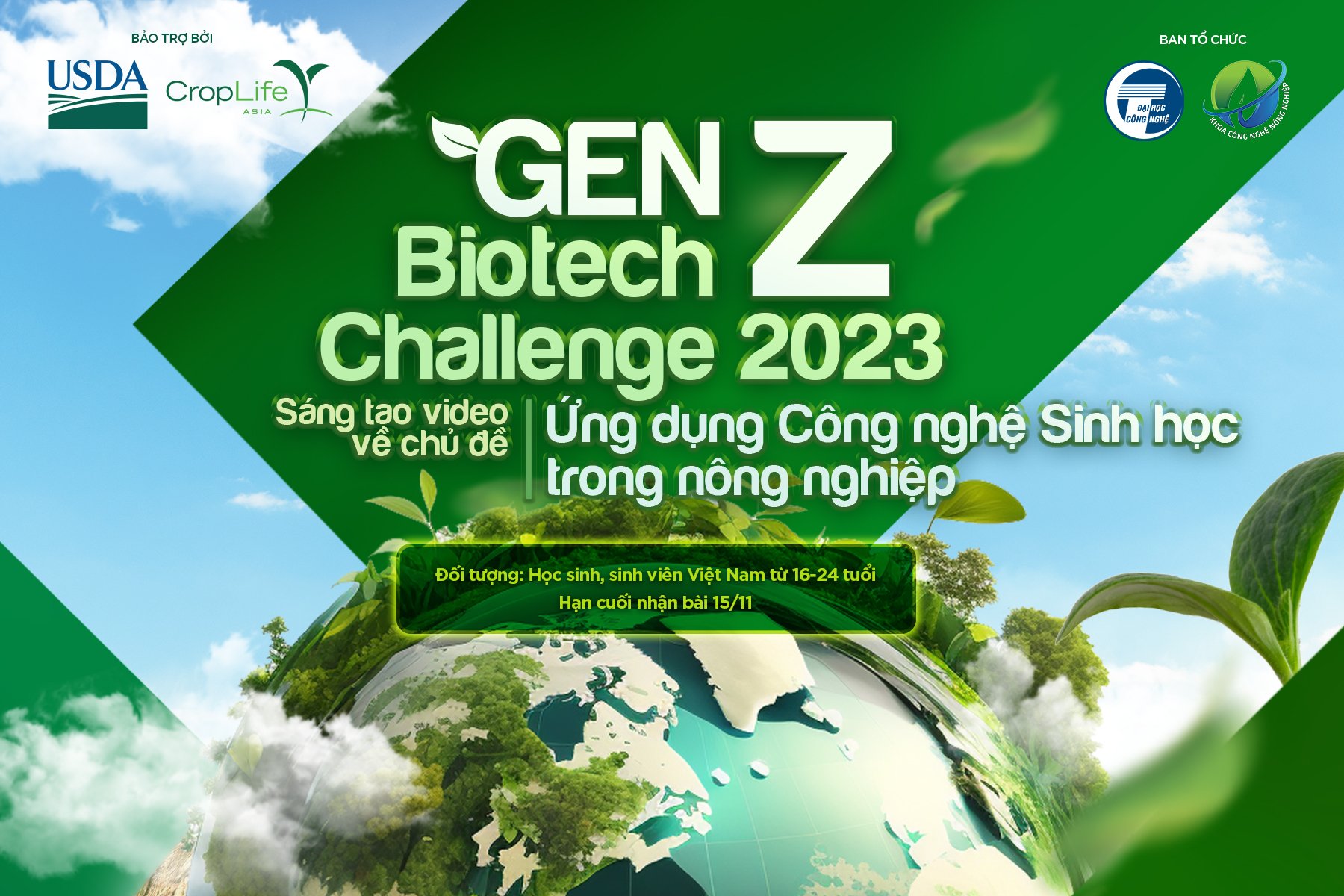 Cuộc thi GEN Z Biotech Challenge 2023 với chủ đề Ứng dụng Công nghệ Sinh học trong nông nghiệp là sân chơi sáng tạo nội dung số dành cho học sinh, sinh viên Việt Nam từ 16 – 24 tuổi do Khoa Công nghệ Nông nghiệp – Trường Đại học Công nghệ – Đại học Quốc gia Hà Nội tổ chức với sự tài trợ và phối hợp của Hiệp hội CropLife Châu Á (CLA) và Phòng Nông nghiệp – Đại sứ quán Hoa Kỳ tại Việt Nam (FAS). Chi tiết dưới đây là thông tin về thể lệ, cách thức tham dự cuộc thi.