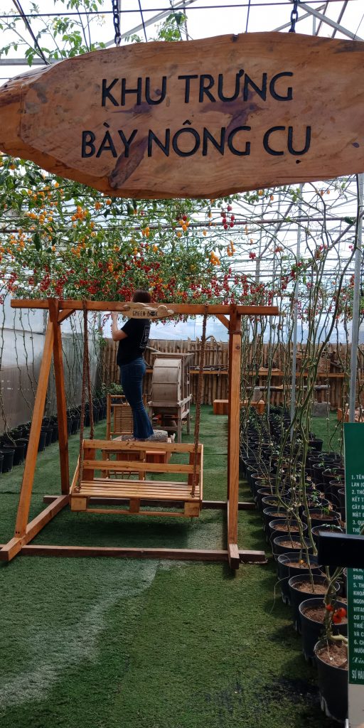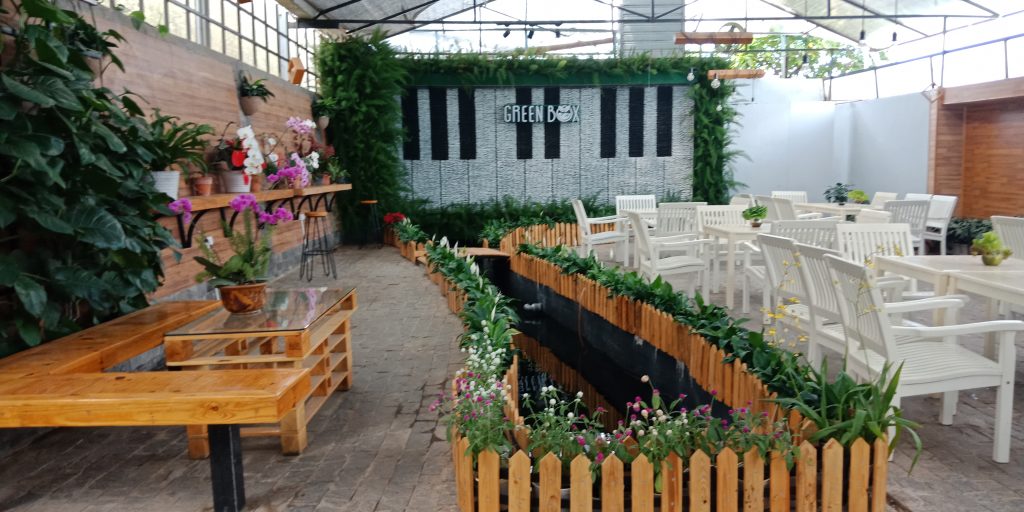 Quán cà phê Green Box nằm trong một khu vườn vừa sản xuất, vừa mang tính trình diễn những mô hình sản xuất NNCNC như autopot, thủy canh, khí canh… với thiết kế thân thiện, độc đáo, mang đậm nét của một trang trại Đà Lạt. Ngay từ lối đi vào quán, đã được trang trí bằng những dây cà chua leo dàn, lúc lỉu quả vàng, đỏ… Trên những bàn gỗ uống cà phê, được trang trí không phải bằng những bình hoa mà là những bình thủy tinh trồng xà lách theo lối thủy canh.